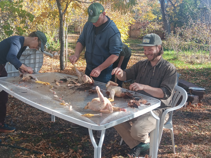 We harvested 10 birds. 4 old hens, 1 old rooster, and 5 young cockerels. The first bird was demonstrated start to finish by the wqorkshop leader and then each participant was welcomed try their hand as each step of the way.