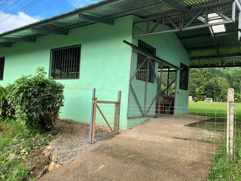 It is actually a double gate : The first is the "Tico style" for the main entrance, that can be opened if a car need to go in, or during big events, the second is a wooden frame with hinges and a spring to have it close automatically.