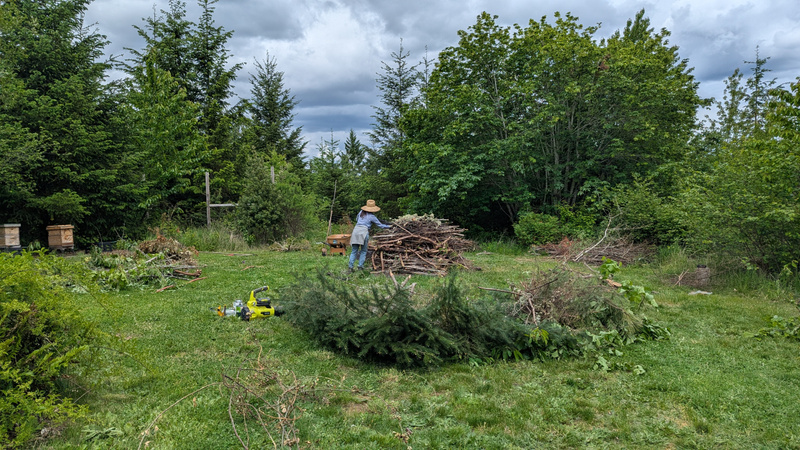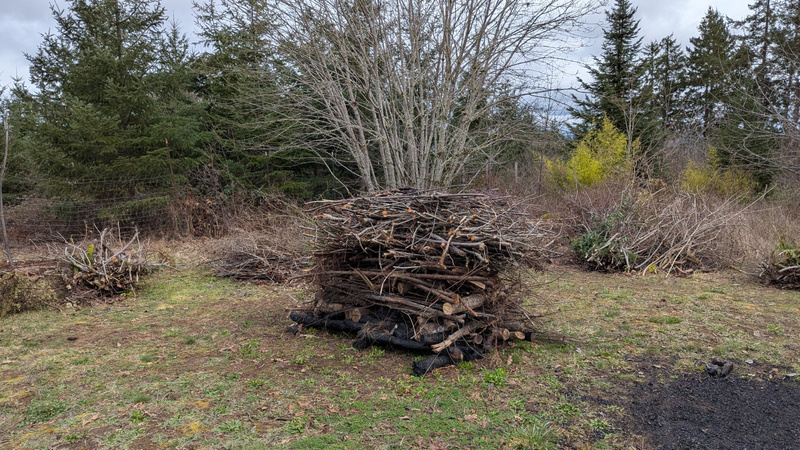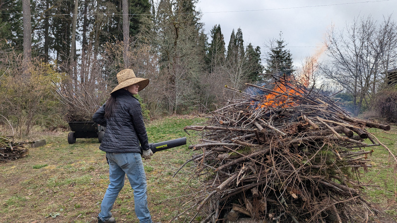 Wood collection is slow and steady — we prune, stack, and drop branches in the burn area over time, depending on how busy we are with other Maybloom projects. Sometimes it takes weeks. Once we feel like we’ve gathered enough, we start building the tower.