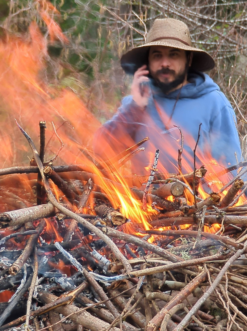 This is where the rhythm kicks in. We feed the fire in batches, keeping the burn hot and aerobic (to reduce smoke and promote clean char). The fire consumes material fast, so we have to stay on it — feeding branches, raking the pile, adjusting airflow.