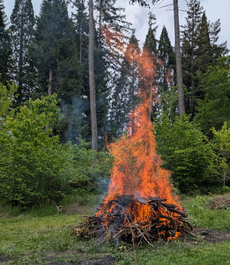 We start by selecting a safe, open spot far enough from trees and buildings — fire safety is key. The fire has to burn hot and clean, and it gets big fast, so space and airflow are important. Once we’ve chosen a site, we start dropping wood there — using our little John Deere mower + trailer to haul trimmed branches from all over the land.
