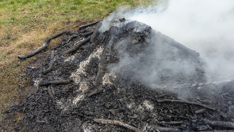 Once the fire burns down and we’re left with glowing embers and charred material, we spread the pieces and quench the pile with water, halting combustion and locking in the carbon. What’s left is rich black biochar, mostly in small, manageable chunks.